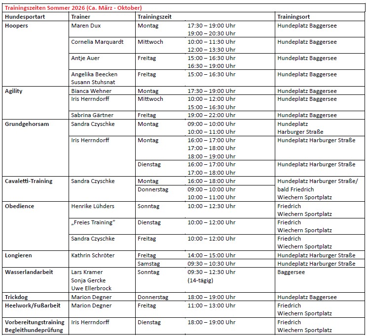Hier findest du alle Trainingszeiten nochmal im Überblick:Â
